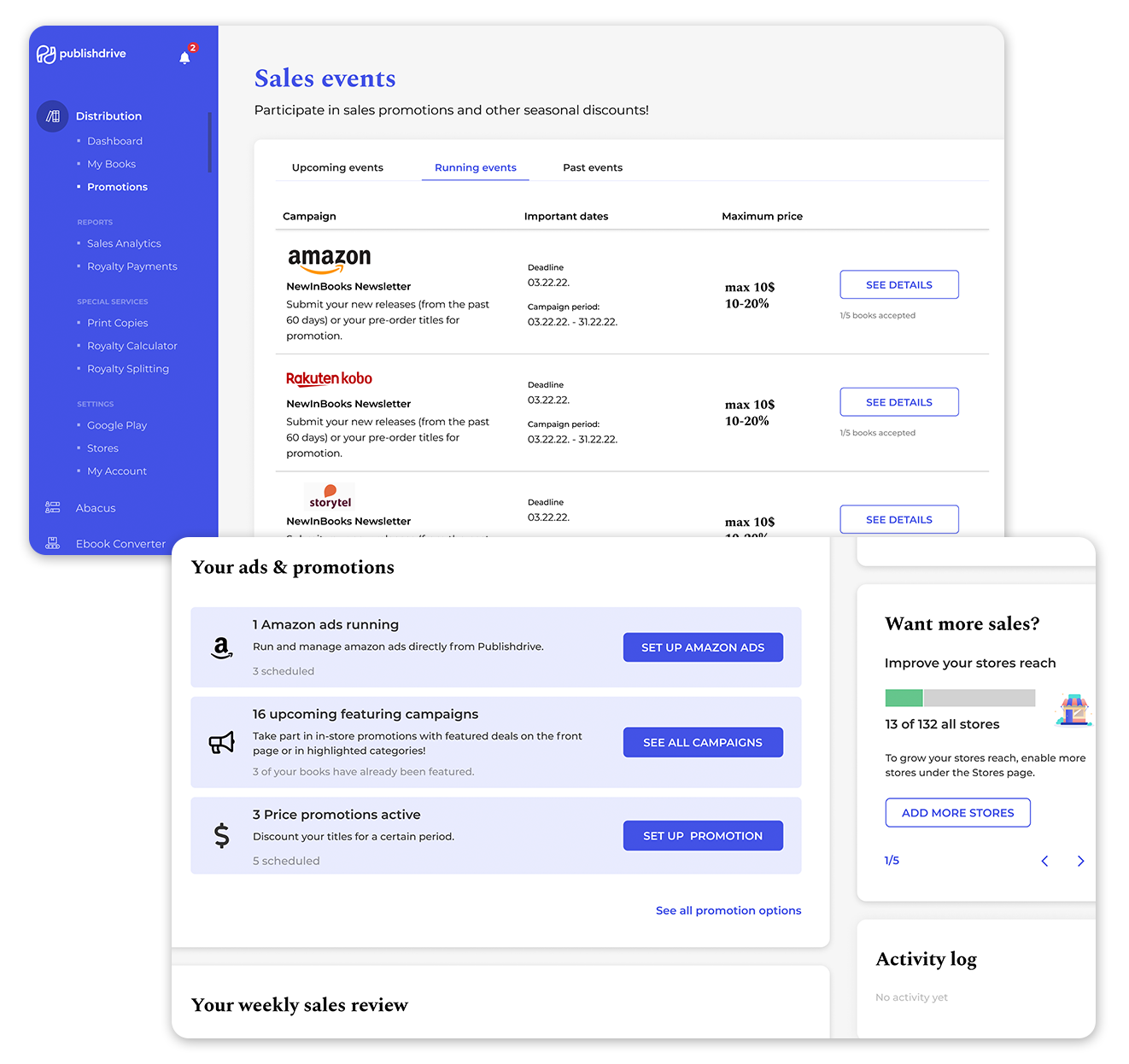 Promote your books using a suite of promotional opportunities straight from the platform: run Amazon book ads, manage discounted offers for your titles on our partner stores, offer review copies, and much more.